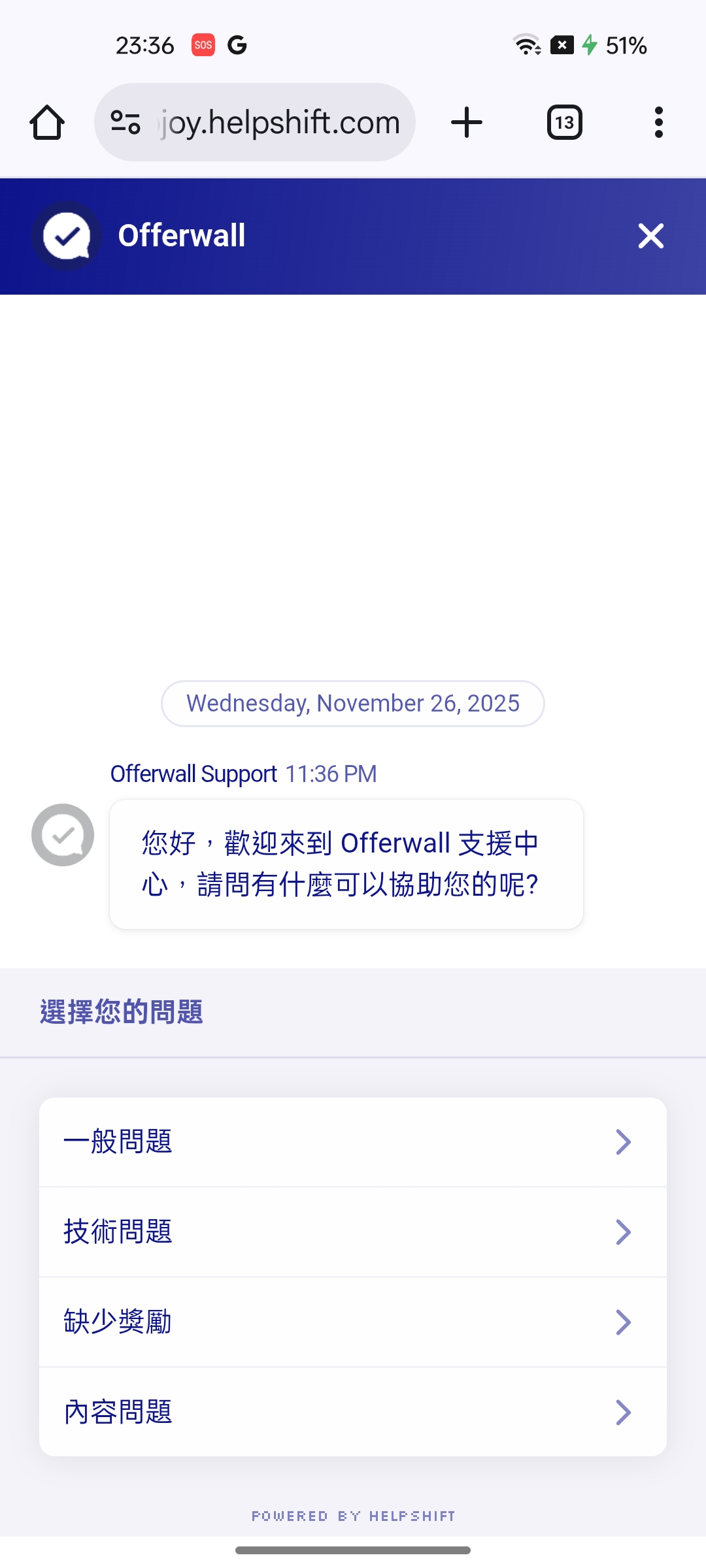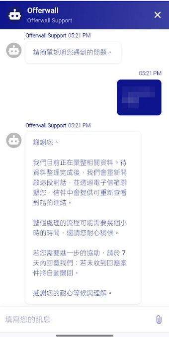 當您填寫完成所有問題後,系統會自動將您的申請傳送給客服處理。您會看到畫面顯示確認訊息,後續將會收到一封電子信件,信件中會提供對話的連結。您也可以使用原本的連結,隨時從 Offerwall 回到該對話,持續查看處理進度。