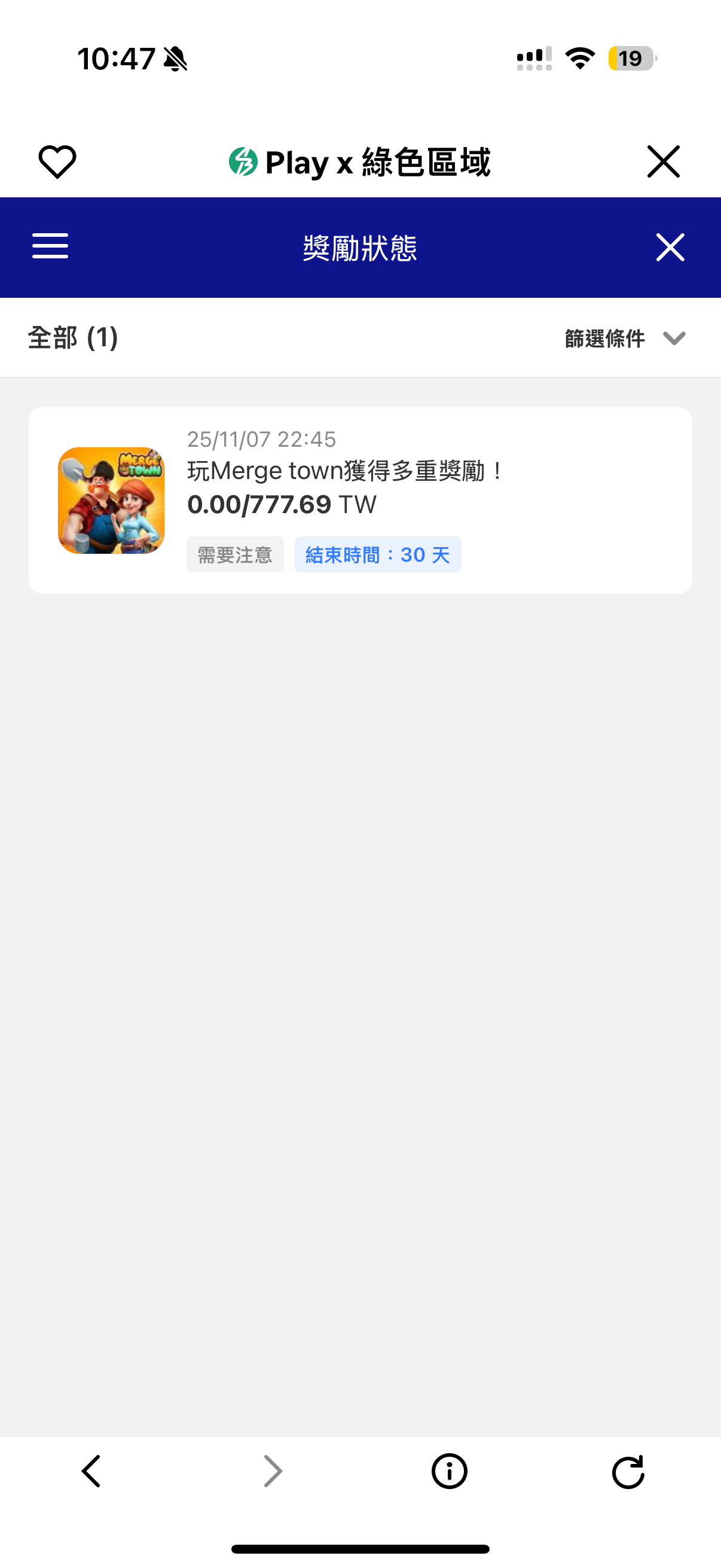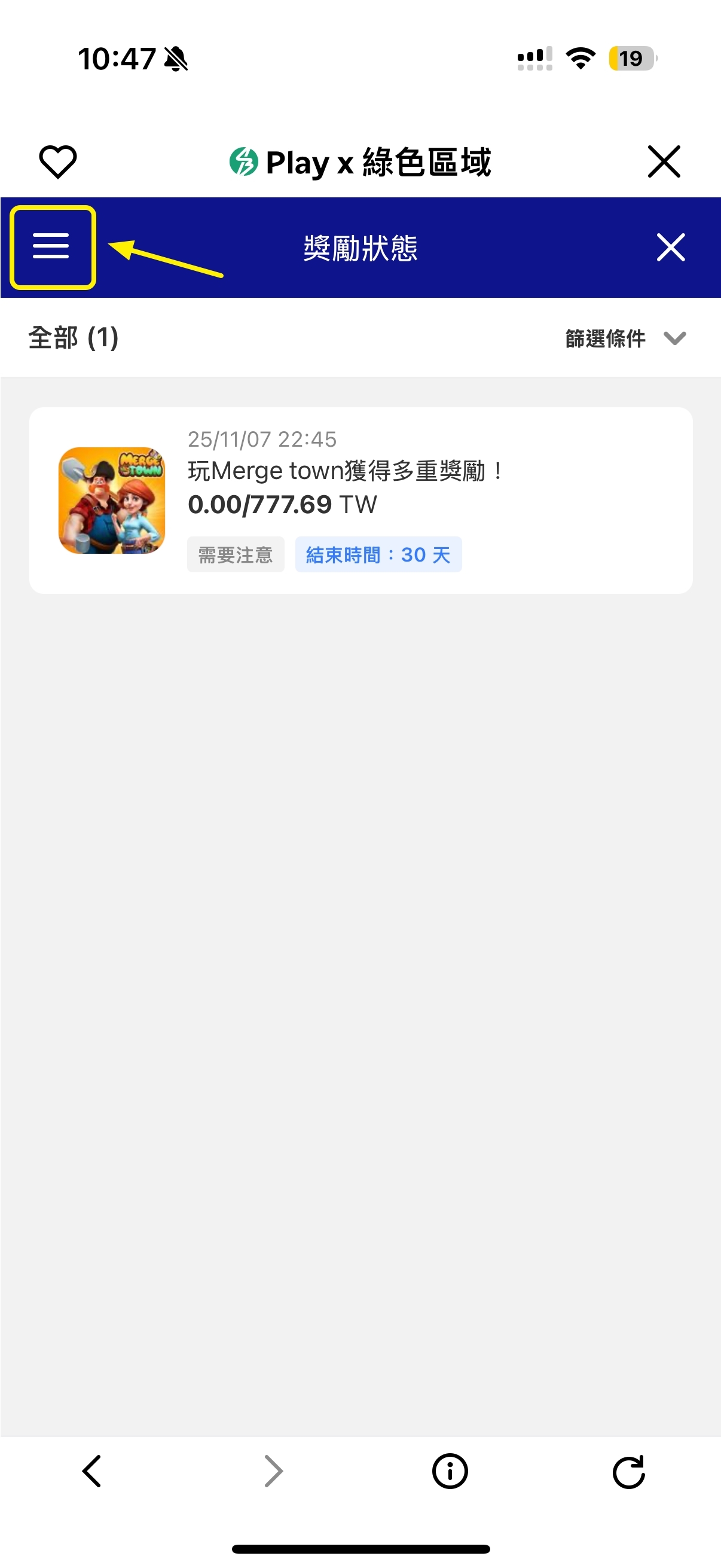 點選左邊的「獎勵狀態」選項,您將會看到三個分類:「進行中」、「已獲得」、「已過期」,請依序點開查看,找尋您參與的那筆優惠。